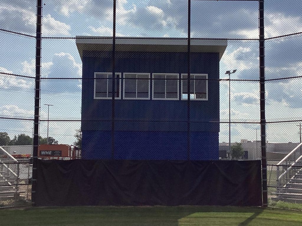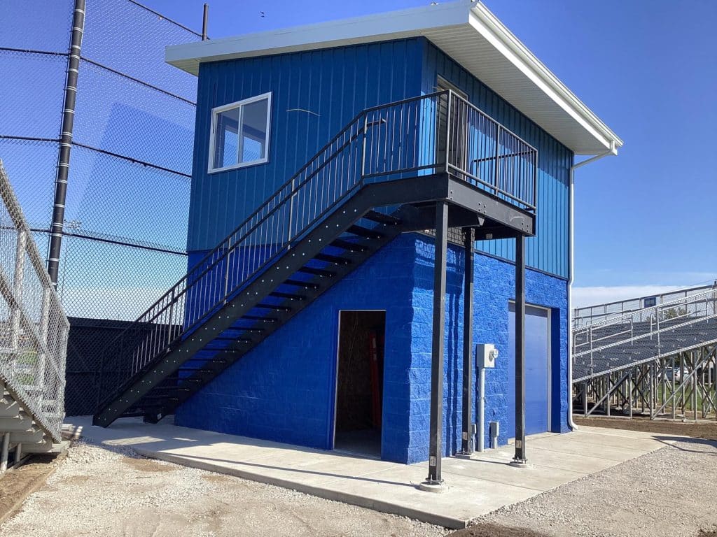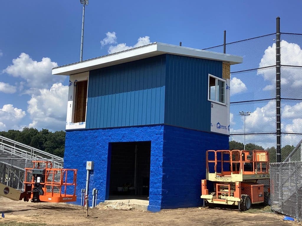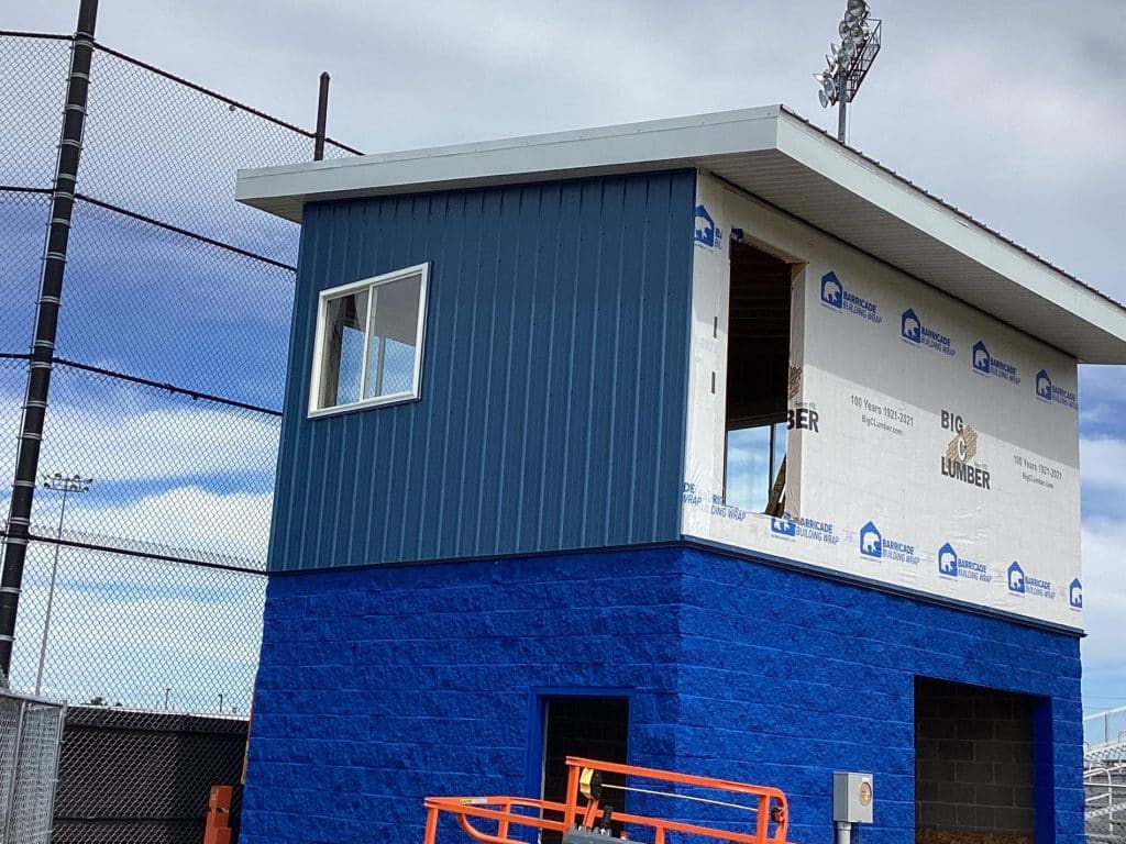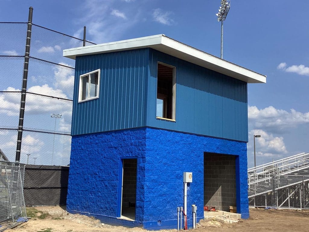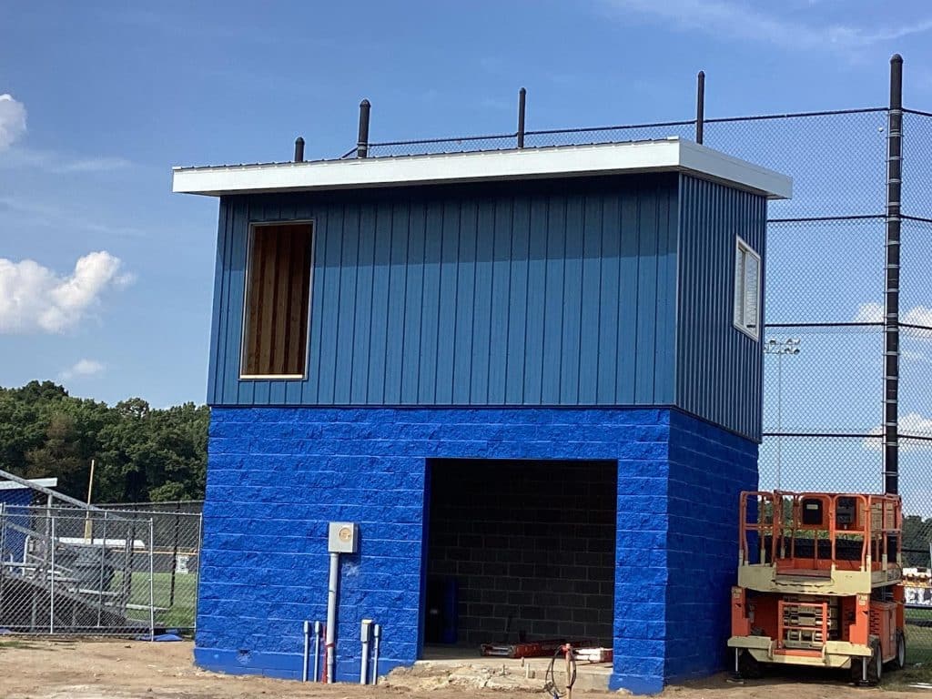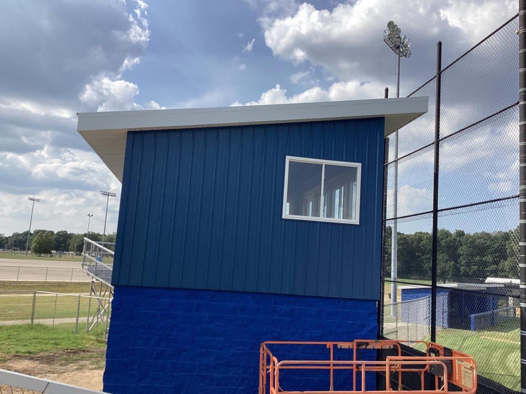 The new press box is a 20-foot by 16-foot elevated facility located directly behind home plate, designed to support media, coaching staff, and game-day operations with durability, functionality, and a professional appearance. Base Level: Built with Concrete Masonry Units (CMU) for a strong, secure foundation. Second Floor: Framed and wrapped in weather-resistant steel siding, offering long-term protection and a clean, modern look. Access: A secure steel exterior stairway provides safe and durable access to the second level. Climate Control: Fully insulated and equipped with an electric heater to maintain comfort during colder months. Technology: Pre-wired for audio systems, internet connectivity, and video feeds. Exterior Design: Finished in school colors.