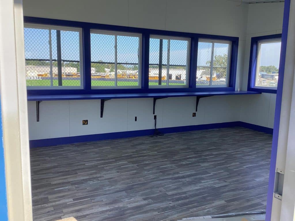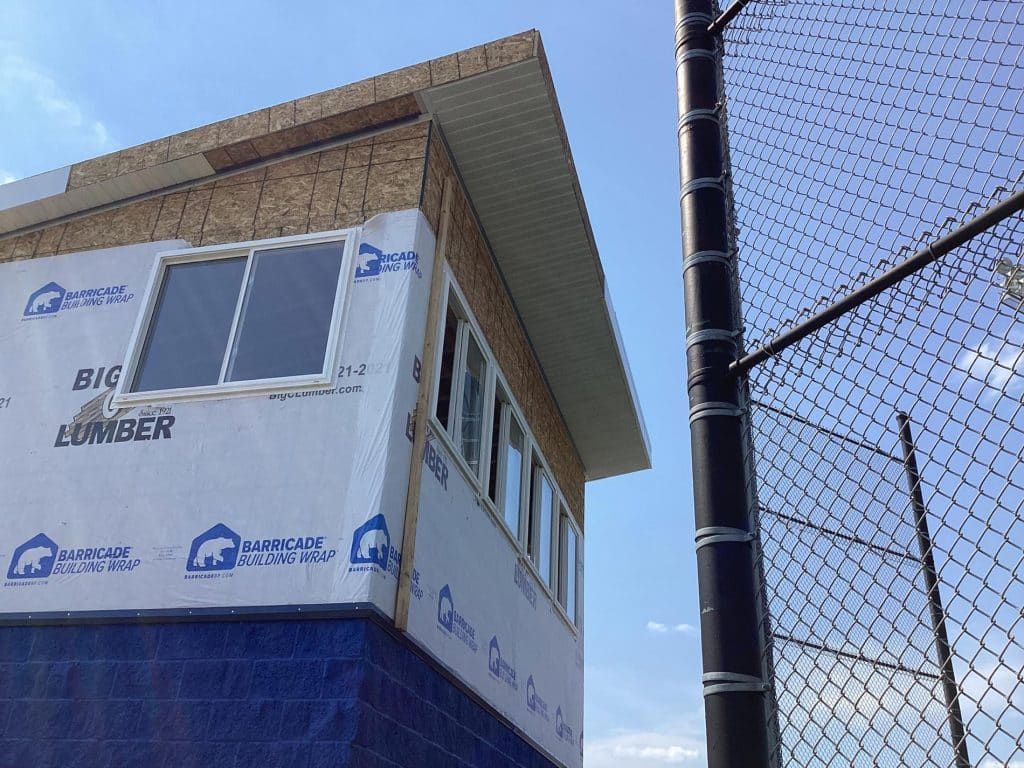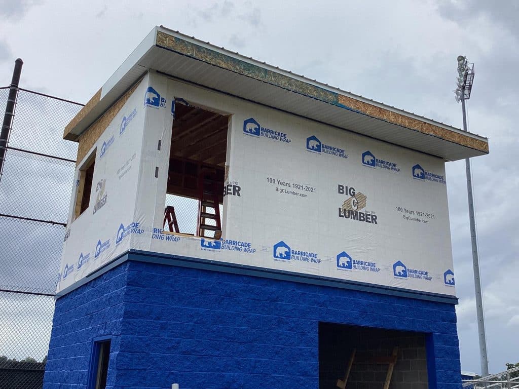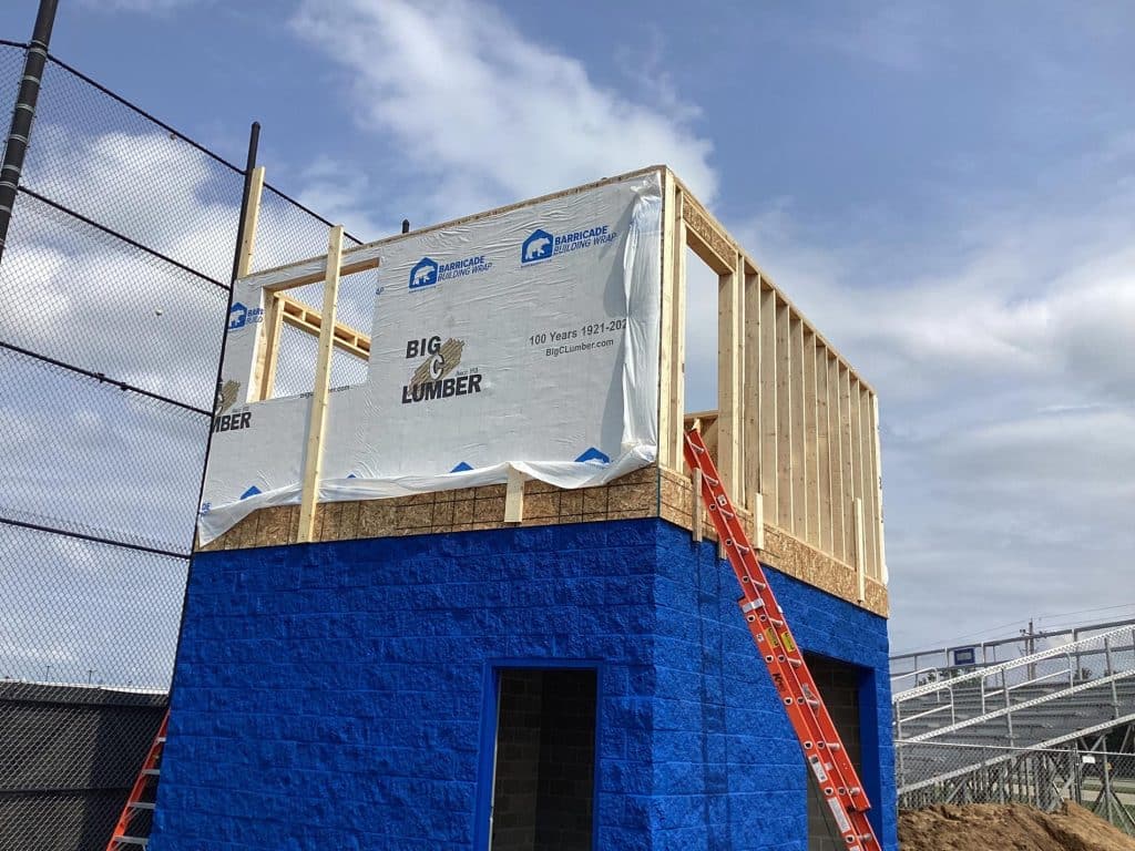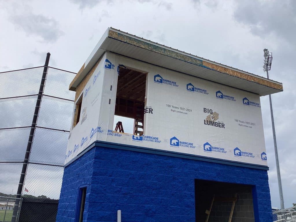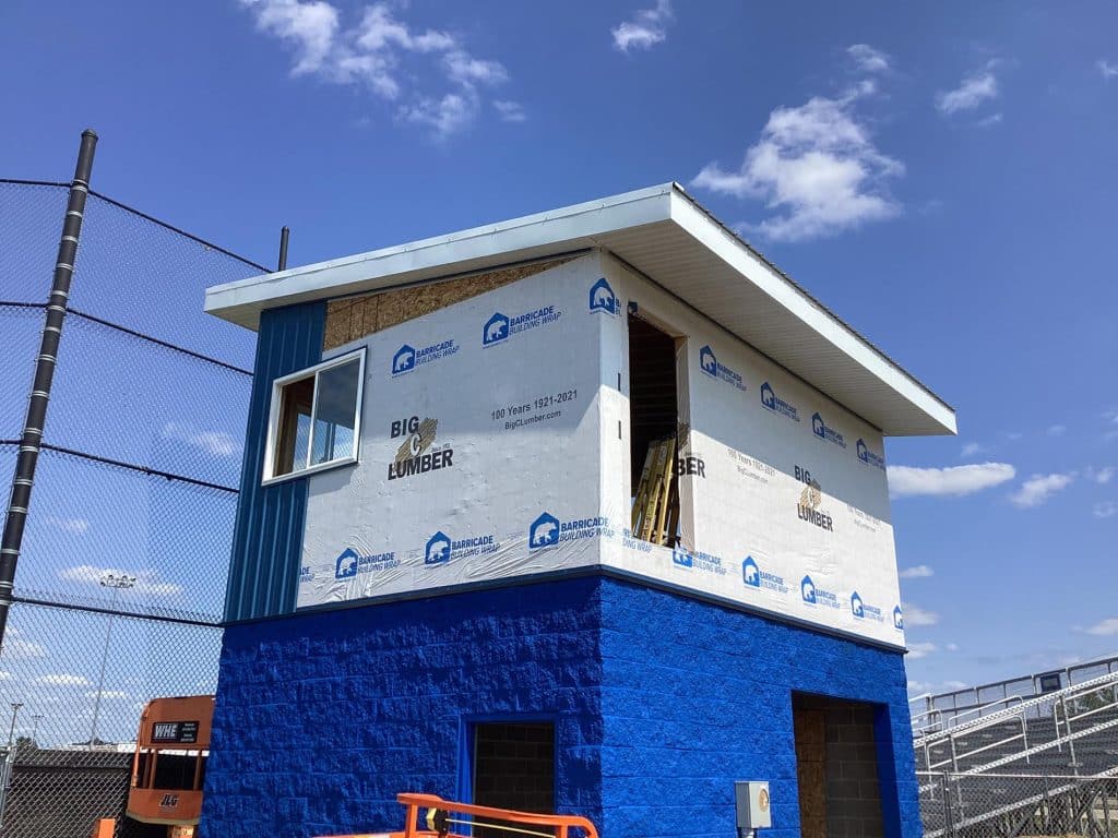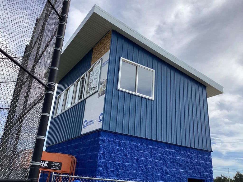 The new press box is a 20-foot by 16-foot elevated facility located directly behind home plate, designed to support media, coaching staff, and game-day operations with durability, functionality, and a professional appearance. Base Level: Built with Concrete Masonry Units (CMU) for a strong, secure foundation. Second Floor: Framed and wrapped in weather-resistant steel siding, offering long-term protection and a clean, modern look. Access: A secure steel exterior stairway provides safe and durable access to the second level. Climate Control: Fully insulated and equipped with an electric heater to maintain comfort during colder months. Technology: Pre-wired for audio systems, internet connectivity, and video feeds. Exterior Design: Finished in school colors.