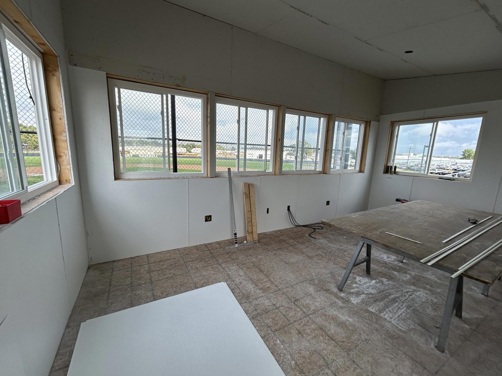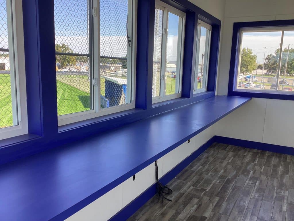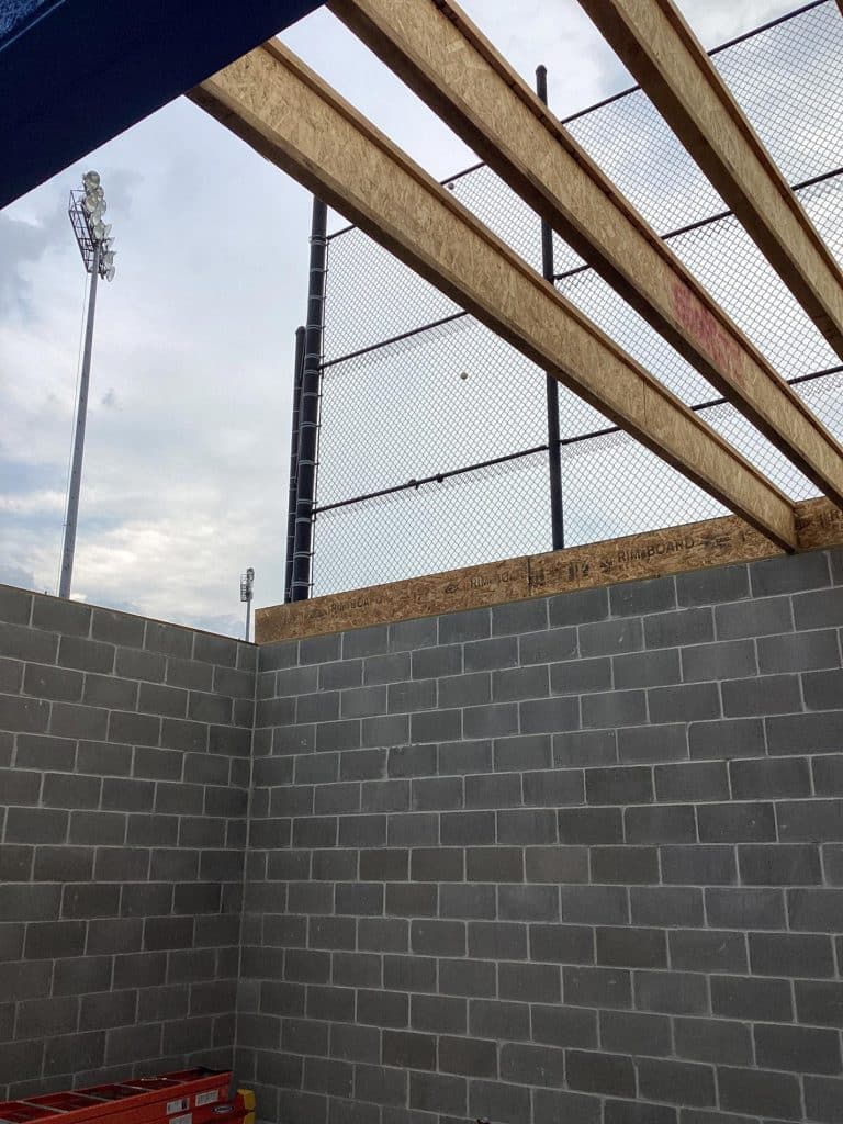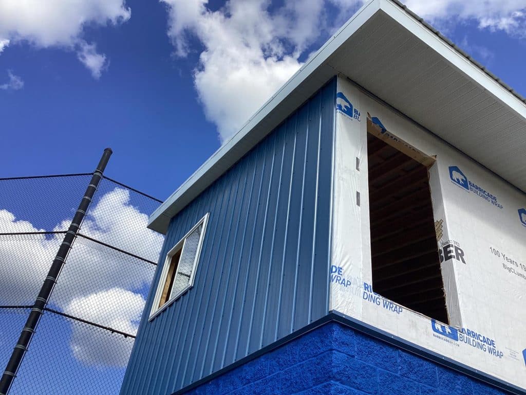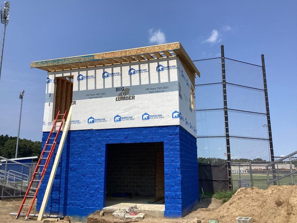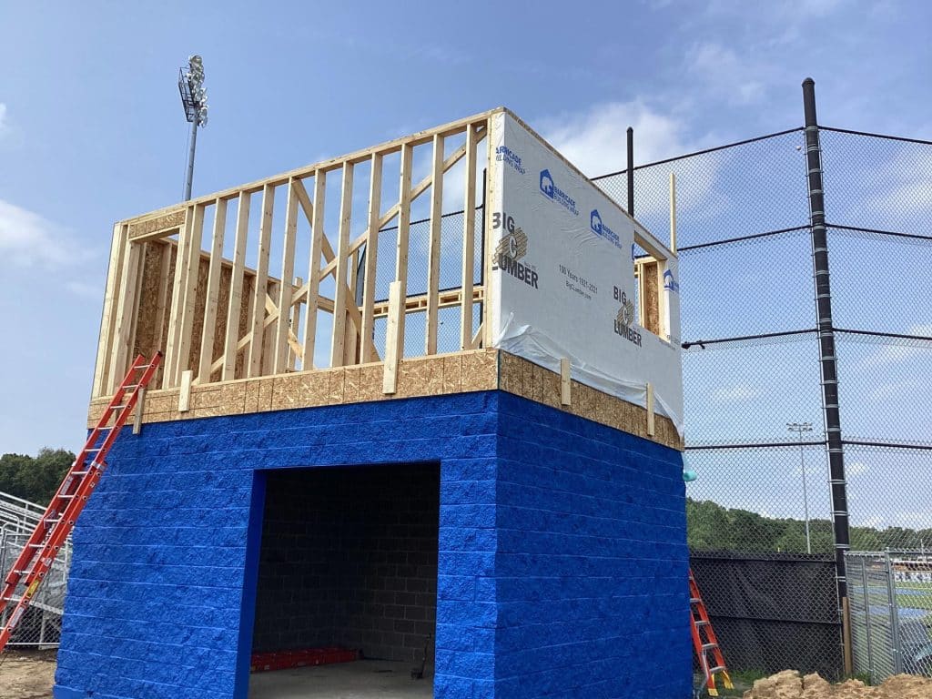 The new press box is a 20-foot by 16-foot elevated facility located directly behind home plate, designed to support media, coaching staff, and game-day operations with durability, functionality, and a professional appearance. Base Level: Built with Concrete Masonry Units (CMU) for a strong, secure foundation. Second Floor: Framed and wrapped in weather-resistant steel siding, offering long-term protection and a clean, modern look. Access: A secure steel exterior stairway provides safe and durable access to the second level. Climate Control: Fully insulated and equipped with an electric heater to maintain comfort during colder months. Technology: Pre-wired for audio systems, internet connectivity, and video feeds. Exterior Design: Finished in school colors.